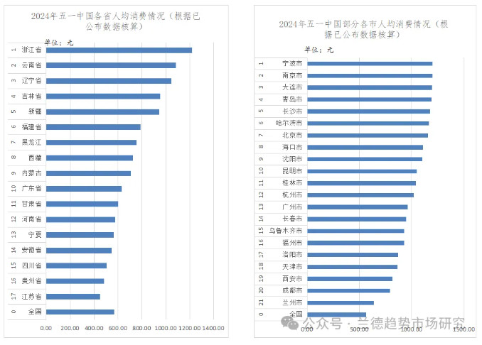 據(jù)數(shù)據(jù)測算,五一全國旅游人均消費(fèi)維持在565.73元。2024年五一期間旅游人均消費(fèi)省排名中,浙江、云南、遼寧、吉林、新疆排名前五;市排名中,寧波、南京、大連、青島、長沙絕對值排名前五。