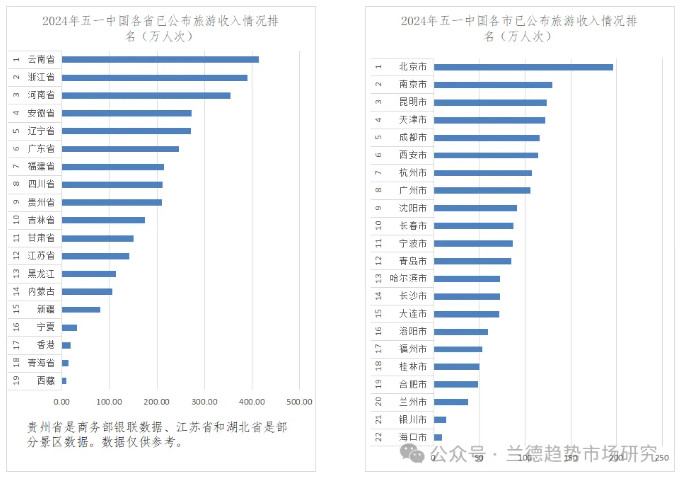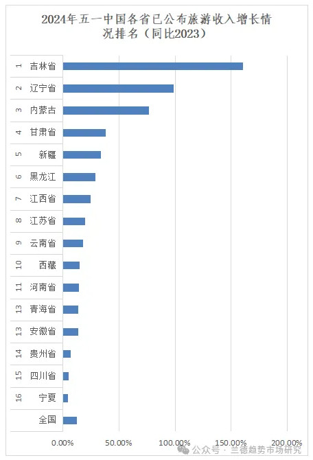引入增長統(tǒng)計(jì)的原因在于,旅游絕對值數(shù)據(jù)受經(jīng)濟(jì)、人口、地域面積、旅游資源分配等影響,即便統(tǒng)計(jì)結(jié)果準(zhǔn)確也不能反映當(dāng)?shù)芈糜伟l(fā)展速度,增長統(tǒng)計(jì)結(jié)果在一定程度上能夠看出當(dāng)?shù)禺?dāng)年或者當(dāng)期在旅游經(jīng)濟(jì)發(fā)展上所做的努力。增長率統(tǒng)計(jì)主要采用的是2024年五一和2023年五一同比數(shù)據(jù)。